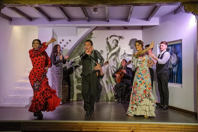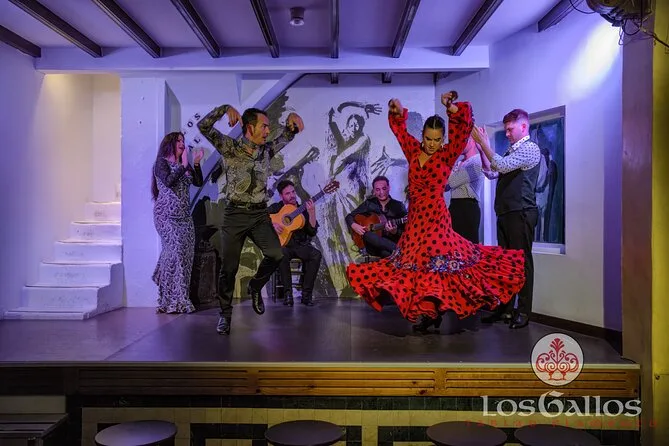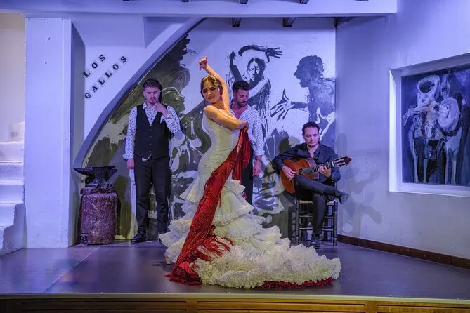 Sua noite inclui assento reservado no Los Gallos Tablao Flamenco para uma apresentação ao vivo com oito artistas renomados — três dançarinos, três cantores e dois violonistas — no histórico bairro Santa Cruz, em Sevilha. Transporte não está incluído, mas há pontos de transporte público próximos; o local é acessível para cadeirantes, exceto os banheiros.