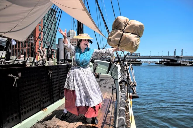 Eu já estava no meio de um “Huzzah!” quando percebi que nunca tinha gritado essa palavra antes. Estávamos naquela sala com eco do Boston Tea Party Ships & Museum, cercados por pessoas vestidas à moda colonial que faziam a gente esquecer que estávamos no século 21. Nossa guia, Sarah (com o sotaque perfeito), entregou cartões com nomes — aparentemente, por uma hora, éramos todos Filhos ou Filhas da Liberdade. Segurei o meu cartão com mais força do que queria. O chão de madeira rangia de um jeito que parecia autêntico, nada encenado.