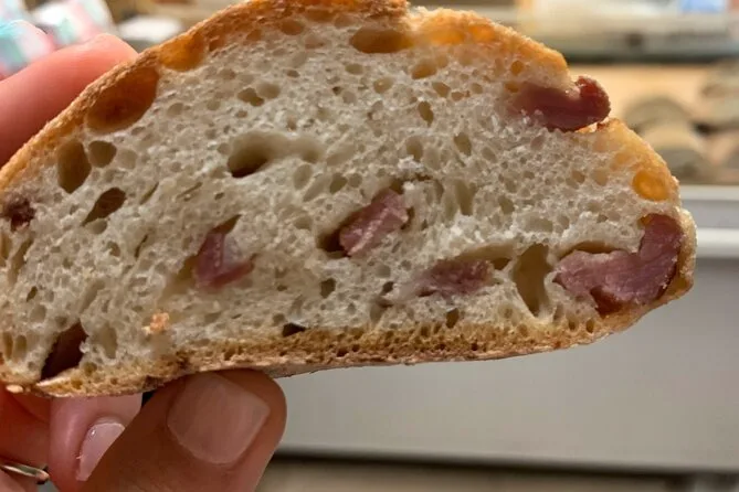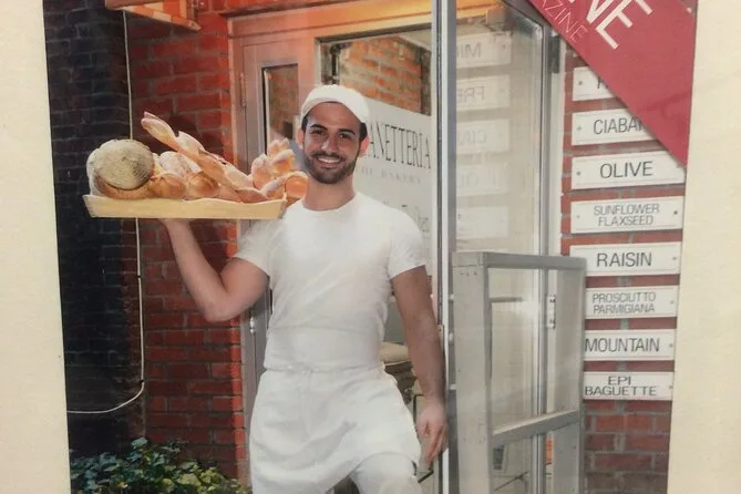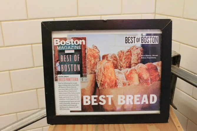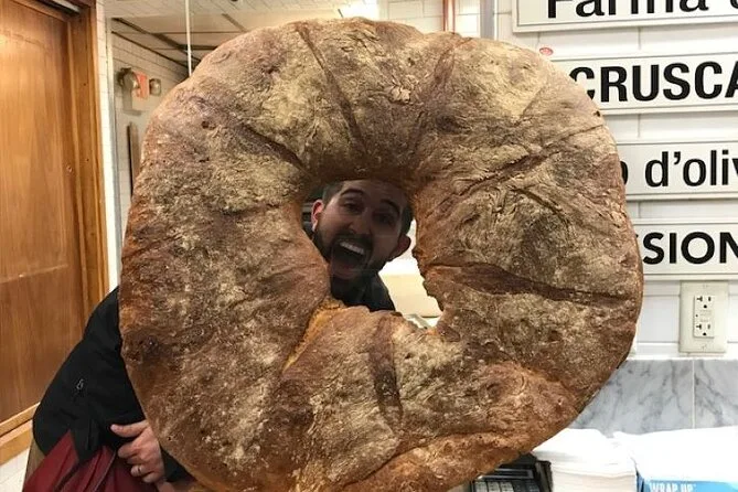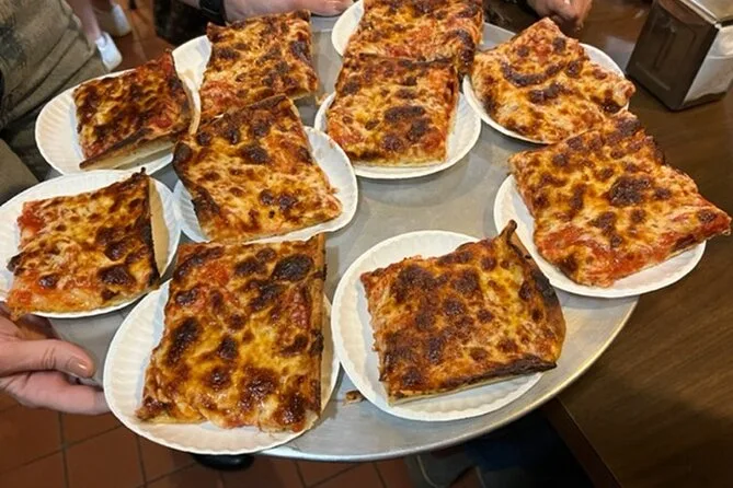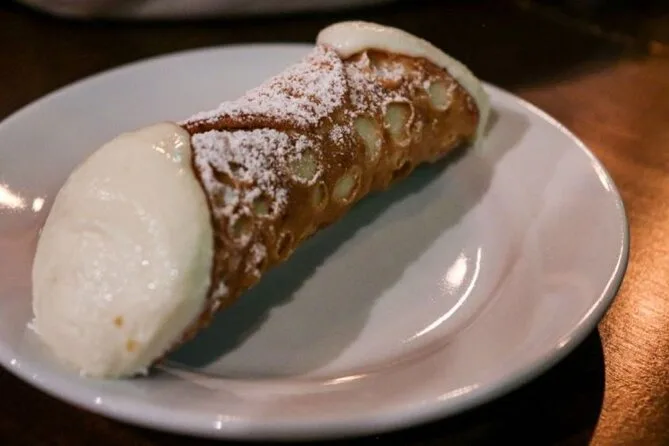O tour inclui degustações de cannoli, pizza siciliana, granizado italiano (sazonal), pão premiado, mussarela fresca, almôndega da Mamma Connie ou limoncello caseiro, rosquinha de cidra, castanhas assadas e chowder.