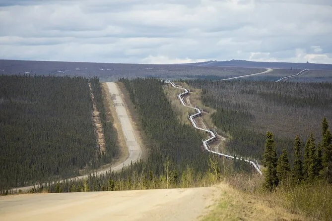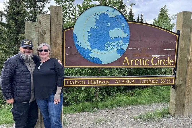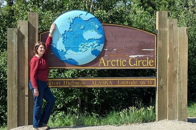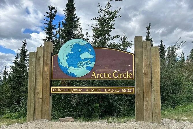 Você verá o oleoduto Trans-Alaska, cruzará o rio Yukon, fará uma parada no Hilltop Restaurant para torta, caminhará pela tundra no Finger Mountain, visitará a lojinha do Yukon River Camp e chegará ao Monumento do Círculo Polar Ártico.
