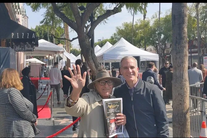 Começamos bem em frente ao TCL Chinese Theatre — aquelas marcas de mãos no cimento são menores do que você imagina — e o Tony nos deu um tempinho para comparar nossas mãos com as da Marilyn Monroe. Acabei me distraindo com um músico de rua tocando um jazzzinho ali perto. Depois, passamos pelo Dolby Theatre (a casa do Oscar!) e seguimos rumo ao letreiro de Hollywood. Ver aquilo ao vivo tem algo surreal, parece que está flutuando sobre tudo. O ônibus era aberto, então dava para sentir o cheiro dos pretzels quentinhos de um vendedor enquanto cruzávamos a multidão.