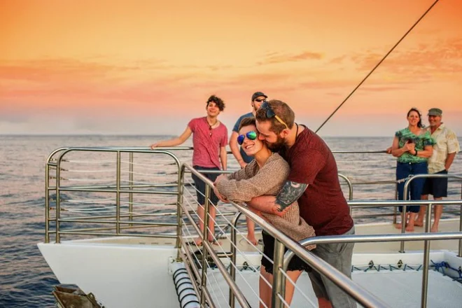 Ria com a equipe local, faça snorkel na Na Pali Coast se o mar permitir, aviste golfinhos e tartarugas do deck do catamarã, e saboreie um jantar descalço enquanto o sol se põe atrás das falésias verdes. Esse cruzeiro ao pôr do sol mistura comida simples, open bar e companhia acolhedora — deixando memórias que parecem histórias, não só fotos.