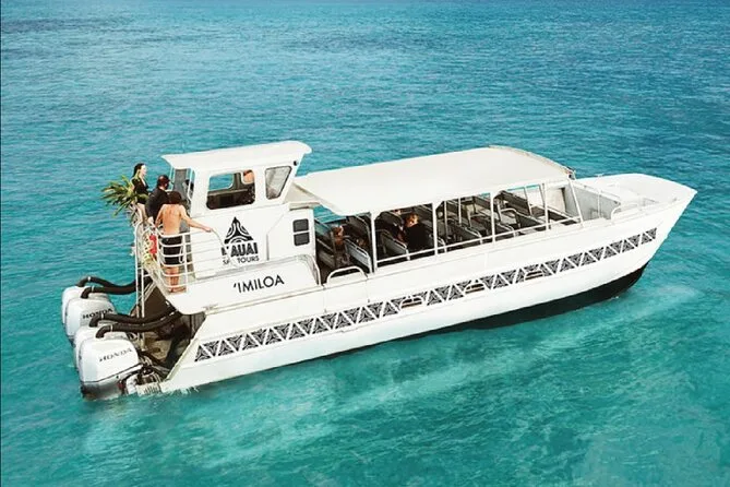Sua tarde inclui uso de equipamento de snorkel com instruções de especialistas se precisar (além de boias ou coletes para flutuação extra), todos os refrigerantes, cerveja, vinho e Mai Tais no open bar (com documento), jantar estilo ilha com buffet de tacos e sobremesa servidos descalço no convés enquanto navega por cachoeiras e falésias — guiado por equipe local a bordo de um catamarã certificado saindo de Port Allen.