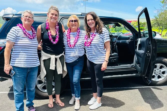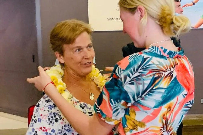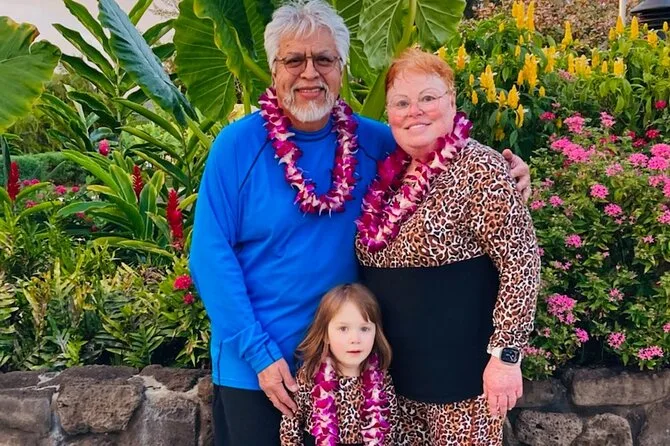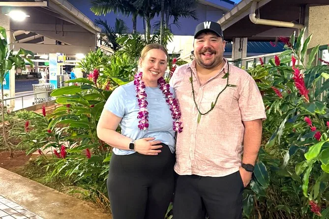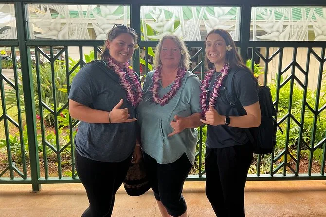 A mulher que nos recebeu (acho que se chamava Malia?) tinha um jeito especial de fazer todo mundo se sentir acolhido — ela até se abaixou para colocar um colar de doces no menino ao meu lado, que ficou radiante, como se tivesse ganhado na loteria. Meu parceiro ganhou um lei de noz kukui e ficou mexendo nele nas mãos, dizendo que era mais pesado e macio do que imaginava. Tiramos uma foto rápida no meu celular — meu cabelo estava todo bagunçado da viagem, mas nem liguei. Até hoje é uma das minhas fotos favoritas da viagem.