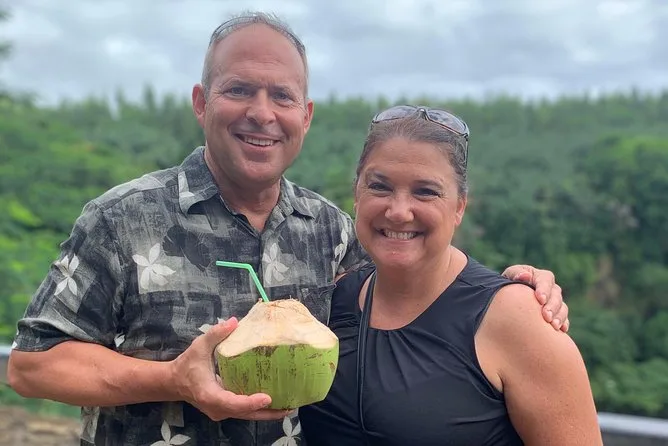 Seu dia inclui água mineral durante todo o trajeto, doces fresquinhos de uma padaria local para começar bem, histórias ao vivo com guias que conhecem cada cantinho de Kauai (e adoram contar piadas de família), além de transporte confortável com ar-condicionado entre as paradas. O almoço não está incluído, mas há bastante tempo para escolher seu lugar favorito em Koloa antes de voltar ao pôr do sol no Menehune Fish Pond.