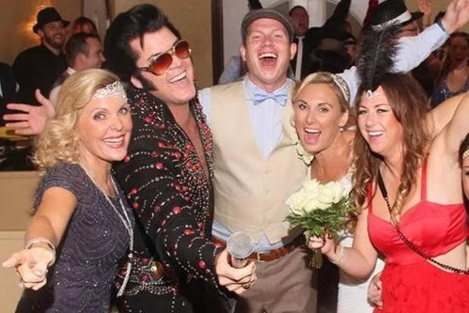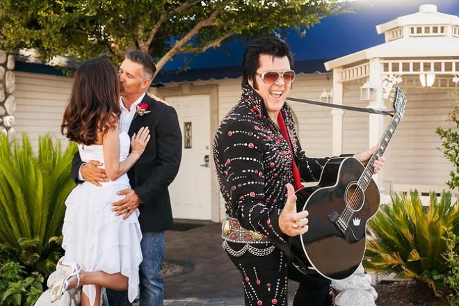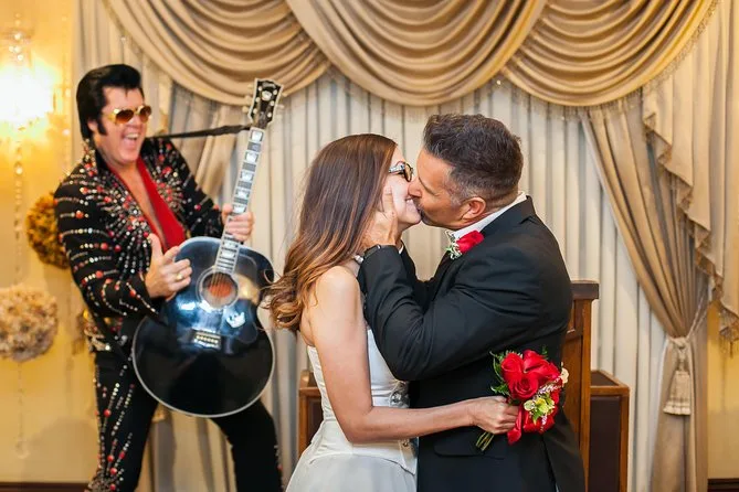 O pacote inclui Elvis acompanhando a noiva pelo corredor, serenatas, flores frescas, fotos e vídeos profissionais (dependendo do pacote), porta-certificado e serviço de limusine.