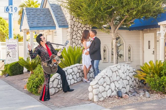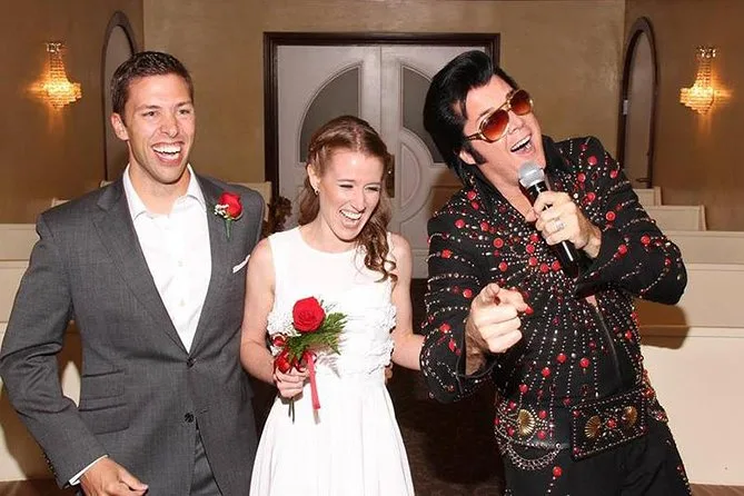 Seu dia inclui serviço de limusine ida e volta para até seis pessoas em hotéis selecionados da Las Vegas Strip, um imitador do Elvis que te acompanha pelo corredor e canta várias músicas durante a cerimônia (seja casamento ou renovação de votos), buquê de rosas brancas frescas e botão combinando, fotografia profissional conforme o pacote escolhido (com fotos digitais ou vídeo), porta-certificado para seu casamento ou renovação — e espaço para até 30 convidados sem custo extra antes de voltar para a Strip.