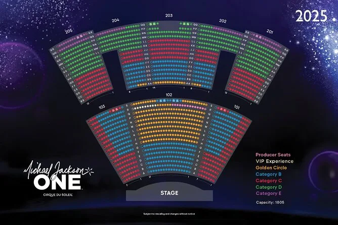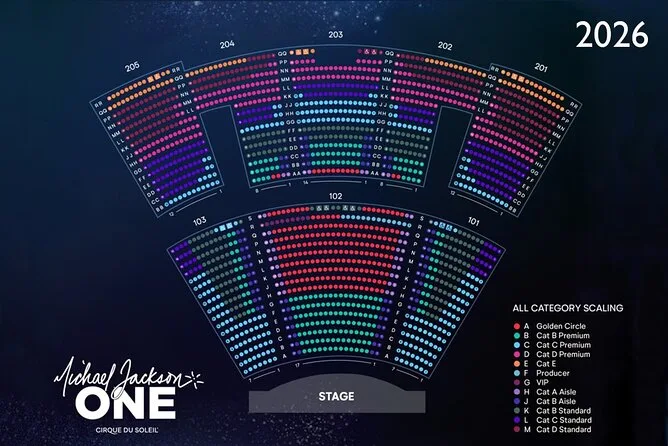 Seu ingresso inclui entrada para o Michael Jackson ONE do Cirque du Soleil no Mandalay Bay Resort and Casino, com taxa de entretenimento ao vivo e assento reservado na categoria escolhida. Acessibilidade para cadeirantes está disponível mediante solicitação no momento da compra; o transporte público facilita o acesso para a maioria dos visitantes.