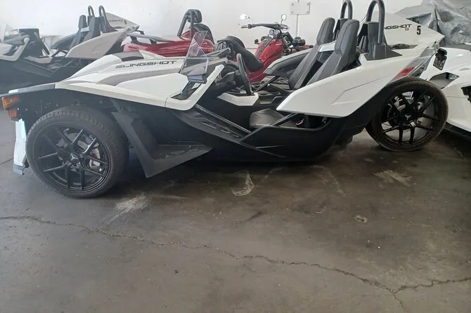 Seu dia inclui um slingshot automático (sem necessidade de carteira de moto), água mineral para a parada em Blue Diamond, seguro completo sem necessidade de depósito, combustível incluso durante todo o trajeto pela Highway 159 perto do Red Rock Canyon, além da companhia de guias locais que conhecem bem essas estradas — só precisa trazer sua carteira de motorista e assinar um termo rápido antes de partir sob o vasto céu de Nevada.
