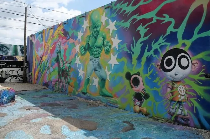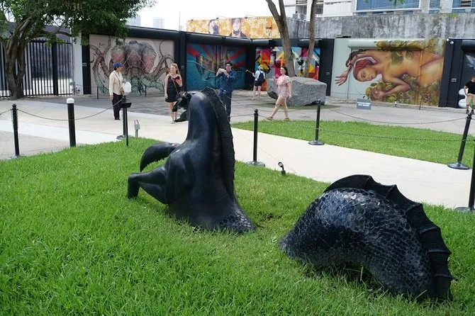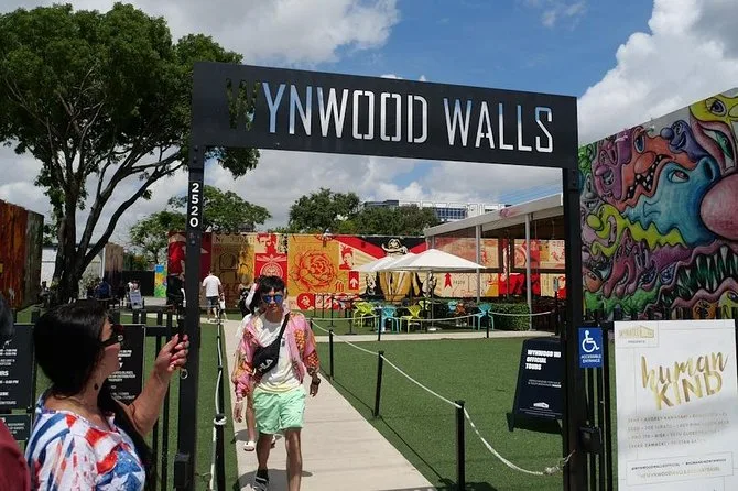 Wynwood tem um estilo único. Os murais estão por toda parte — rostos gigantes, cores vibrantes e até uma parede cheia de flamingos pintados com spray. Passamos cerca de 30 minutos explorando o Wynwood Walls. Sempre tem alguém tirando fotos ou fazendo esboços. Se prestar atenção, vai ouvir música saindo dos bares próximos, mesmo durante a tarde.