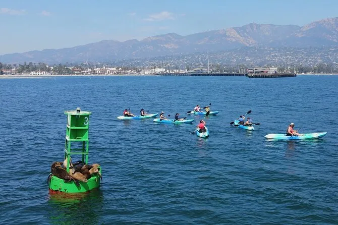 Remamos juntos, desviando de alguns barcos de pesca — sempre tem mais movimento no porto do que parece. A palavra-chave aqui é “passeio de caiaque Santa Barbara”, mas, na real, parecia menos um passeio turístico e mais como flutuar no quintal de alguém. Alex apontou uns veleiros enormes (um deles, segundo ele, era de um rockstar aposentado?), e de repente, leões marinhos começaram a latir para a gente de uma boia. Eles têm um cheiro forte... não se escondem disso. Mas ver eles se mexendo desengonçados fez todo mundo rir. Tentei falar algo sobre eles em espanhol (não sei por quê), e Alex só balançou a cabeça.