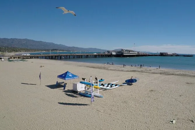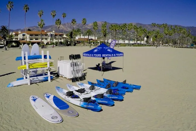 Você encontra o guia na West Beach, em frente ao Harbor View Inn Hotel (28 W Cabrillo Blvd). Procure as bandeiras azuis perto do galpão de equipamentos.