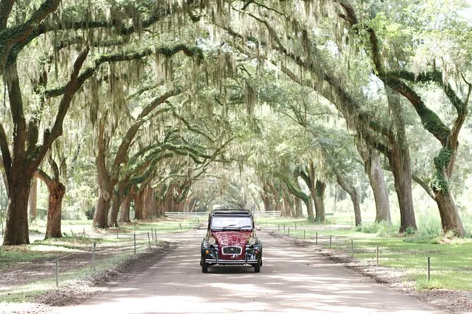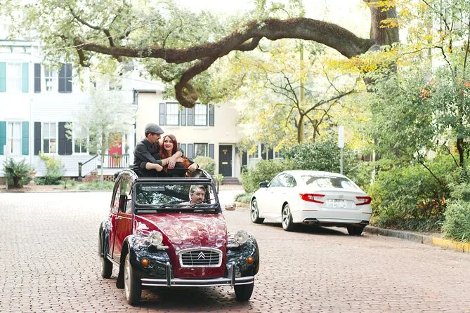 Seu dia inclui água mineral durante o passeio em um Citroën 2CV conversível vintage, com um guia local particular que vai te levar pelo distrito histórico de Savannah, passando por pontos como Forsyth Park, Mercer Williams House Museum, Chippewa Square, Telfair Academy, City Market, River Street, Colonial Park Cemetery e muito mais — tudo no seu ritmo, terminando perto de cafés e lojas ao redor do Forsyth Park.