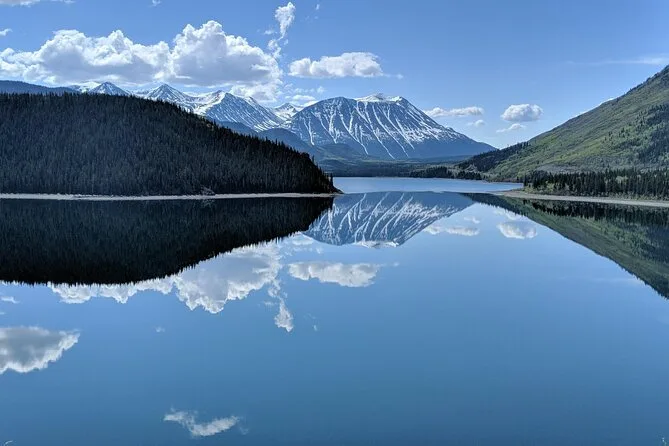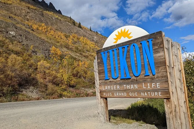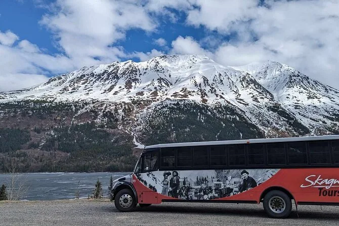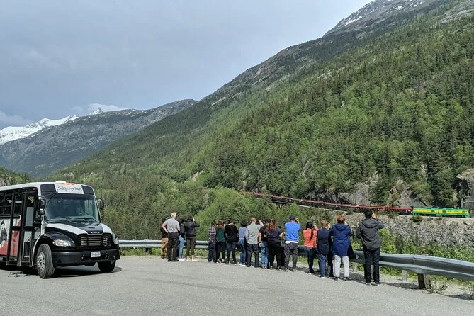 O passeio inclui paradas para fotos em Pitchfork Falls, White Pass Summit, placa Welcome to Yukon, Deserto Carcross, Emerald Lake e a vila de Carcross.