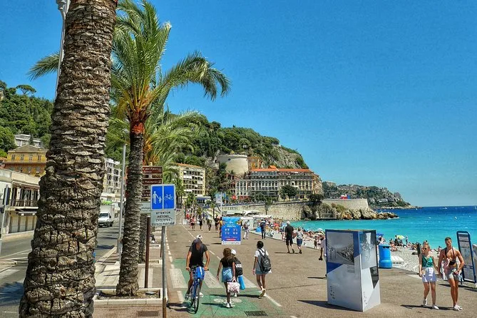 A distância exata não é especificada, mas envolve caminhar entre várias paradas no centro de Nice.