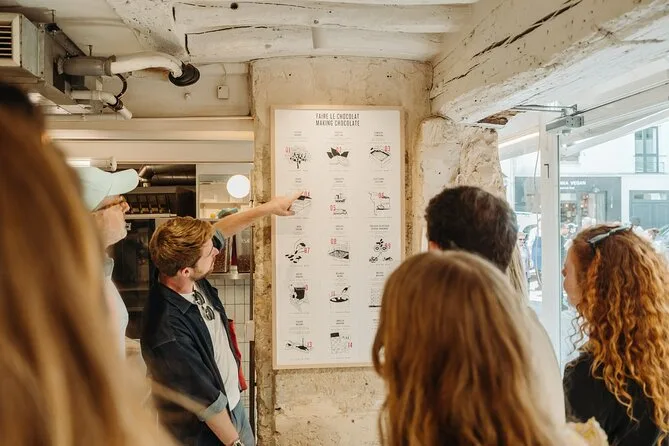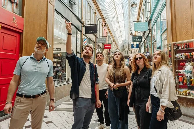 A caminhada me surpreendeu (calçado confortável é essencial). Passamos por três passagens diferentes no coração de Paris, cada uma mais silenciosa que a outra. Em certo momento, paramos para chocolate — dava pra sentir o cheiro antes de ver a loja. O chocolatier nos chamou com as mãos cobertas de pó de cacau; parecia que estava acordado desde o amanhecer preparando tudo do zero. Provar aquelas criações ali, na hora, foi quase como desvendar um segredo.