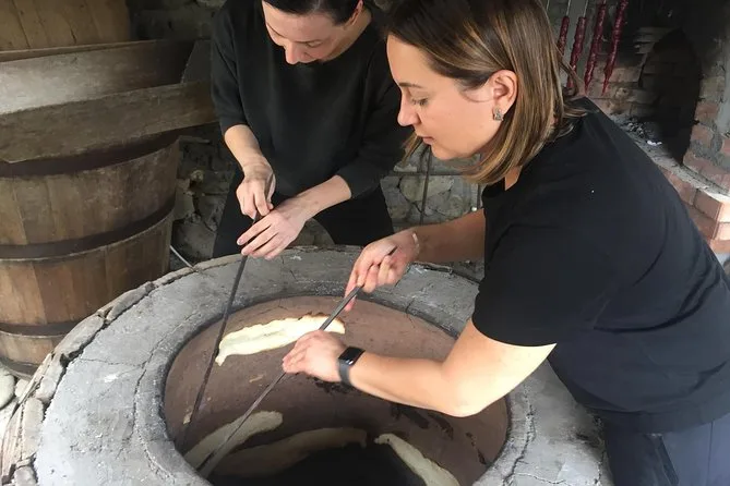 Sim, os visitantes são convidados a ajudar a fazer pão tradicional georgiano numa padaria da vila.