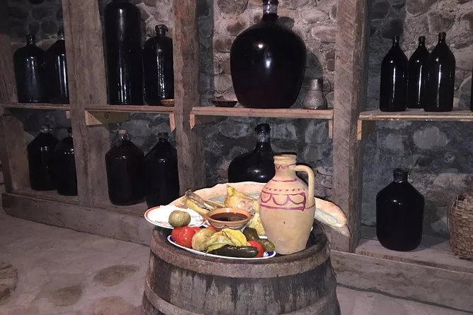 Depois veio minha parte favorita: uma pequena vinícola familiar onde conhecemos Irakli, o enólogo. Antes mesmo de nos apresentarmos direito, ele já me ofereceu um cálice de vinho âmbar. Entramos na adega — o ar fresco, os qvevris de barro meio enterrados no chão. Ele explicou que aprendeu tudo com o avô (tentei agradecer em georgiano e todo mundo riu). A degustação ali foi diferente — menos formal, parecia que estávamos sendo convidados para a sala de casa. E aí veio a chacha — uau. Queima, mas de um jeito bom. Tinha também queijos e pães caseiros; saindo quentinhos do forno e sumindo em segundos.