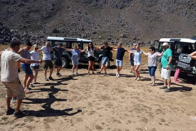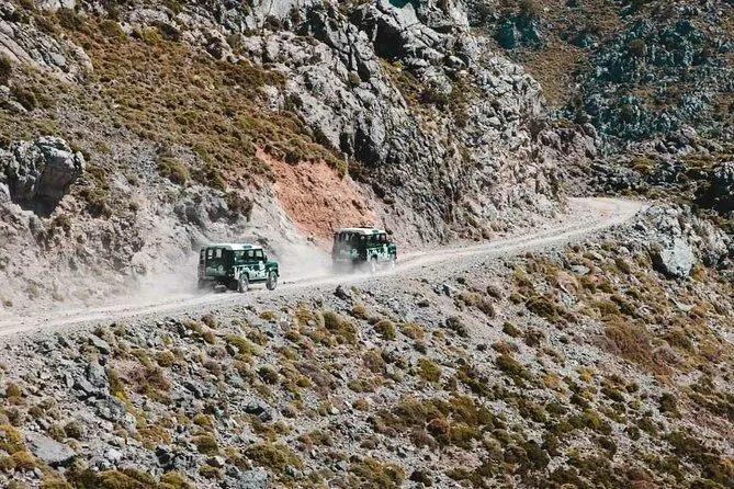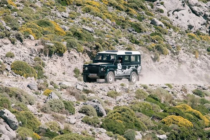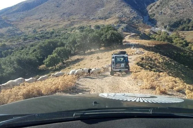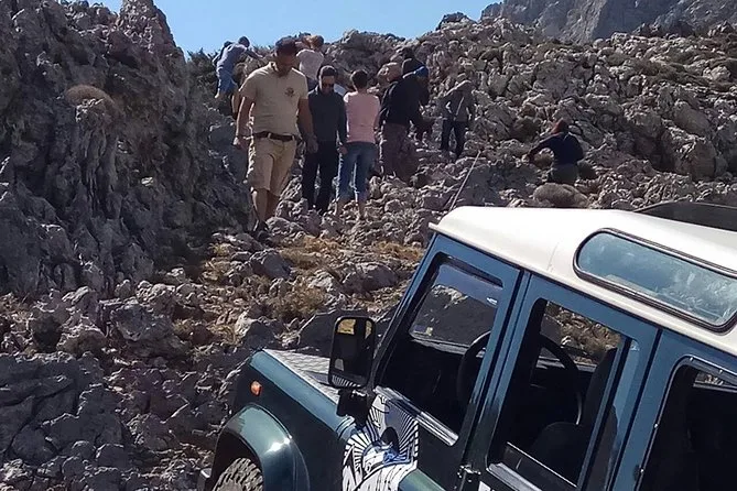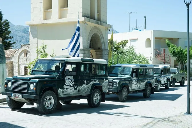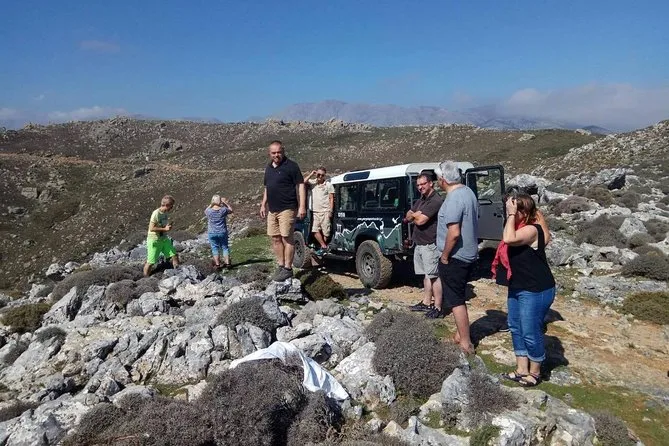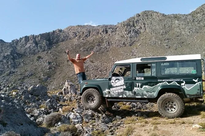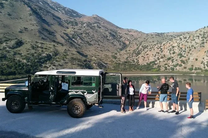 O dia inclui transporte de ida e volta do hotel em Georgioupolis ou regiões próximas; passeio off-road em Land Rover Defender; visitas guiadas ao Lago Kournas, Montanhas Brancas (Lefka Ori), mirante do Desfiladeiro de Imbros; degustações de mel, raki, orégano; almoço com bebidas numa taverna familiar; banho numa praia isolada ao sul; entrada em fábrica de azeite com degustação — tudo conduzido por guias locais experientes, retornando à noite.