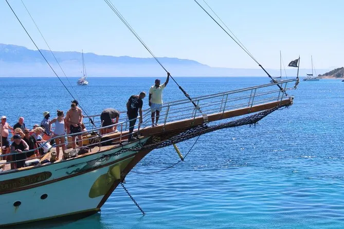 Seu dia inclui embarque no iate de madeira do Capitão Hook no porto de Kos, com WiFi e banheiro a bordo; áudio guia personalizado via smartphone; paradas para banho em Platy e Pserimos; tempo para degustar mel e suco de laranja na vila de Vathy, em Kalymnos; além de um almoço grego fresquinho servido no barco (com opções vegetarianas ou veganas se combinadas antes). Bebidas são à parte — é só pedir no bar quando quiser.