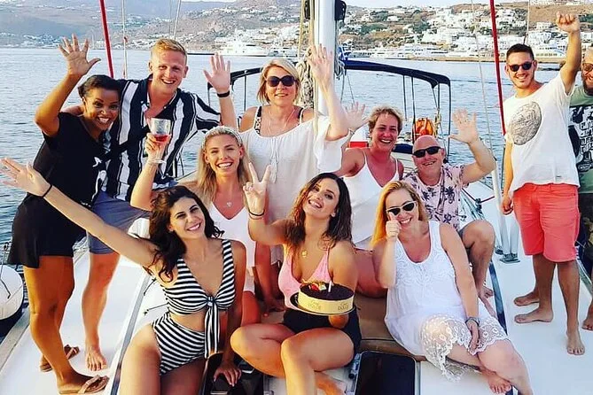 Seu dia inclui transporte gratuito de ida e volta do hotel em Mykonos, navegação a bordo do Nadia K com WiFi, entrada no sítio arqueológico de Delos com guia local, uso do equipamento de snorkel na ilha de Rhenia, banheiro a bordo durante toda a viagem, além de um almoço relaxante servido enquanto ancorados nas águas calmas do Egeu antes de retornar à tarde.