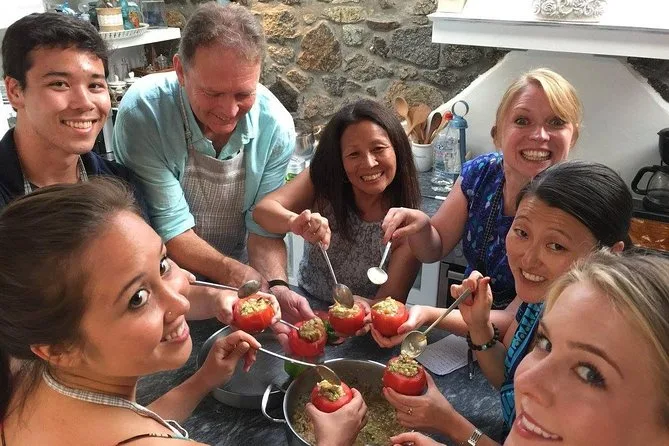 Seu dia inclui transfer ida e volta do hotel ou porto do cruzeiro até a cozinha da casa Mykonian Spiti, onde você participa de uma aula prática exclusiva de culinária grega com todos os equipamentos de proteção. Almoço ou jantar são servidos com vinho e bebidas locais — e antes de voltar, você recebe uma foto de lembrança e uma pequena sacola com produtos típicos de presente.