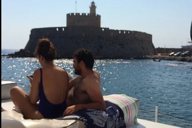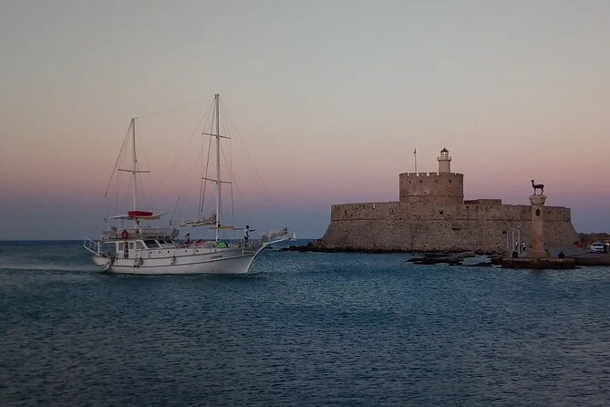 Voltando para Rhodes, a música ao vivo começou — só dois músicos, nada exagerado, mas combinou. Em um momento, parei de falar e fiquei só olhando as muralhas da cidade iluminadas refletindo na água escura. É difícil explicar por que essa imagem ficou mais forte que qualquer foto. Talvez porque todo mundo no convés ficou em silêncio por um instante — parecia que sentíamos aquilo juntos. Então, se você está pensando em um passeio de um dia ou um cruzeiro ao pôr do sol em Rhodes com comida e música, esse é o que eu escolheria de novo.
