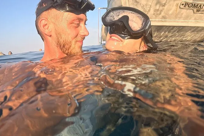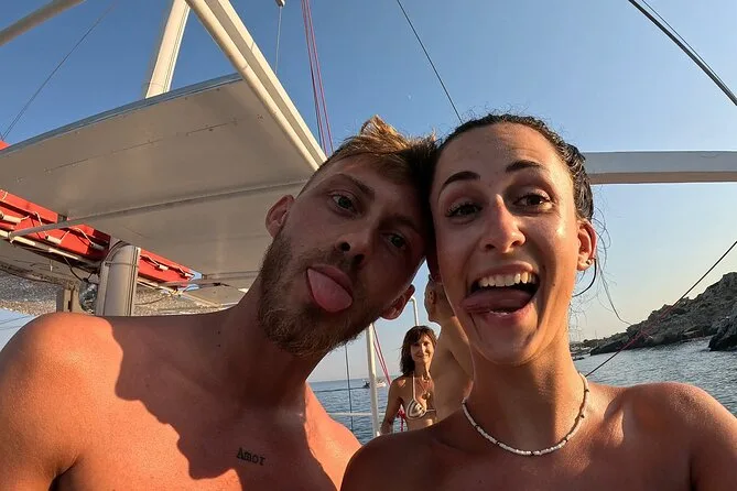 Seu passeio inclui uso de equipamento de snorkel e boias para nadar nas fontes de Kallithea; open bar com coquetéis, vinho, cerveja e bebidas não alcoólicas; buffet grego gourmet fresco com opções veganas e sem glúten; música ao vivo no retorno ao Porto Mandraki; além de assentos reservados para você relaxar durante todo o passeio.