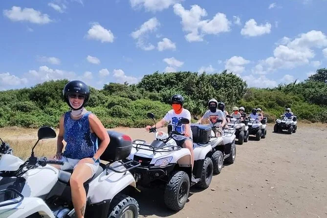 O dia inclui traslado de ida e volta do hotel em áreas selecionadas do sul de Rodes, uso do quadriciclo com combustível incluso, capacetes e equipamentos contra poeira fornecidos pelo guia, água engarrafada para refrescar durante o trajeto e mapas para você não se perder — mesmo que às vezes pareça que está perdido por ali.