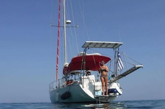 Você vai embarcar em um veleiro em grupo pequeno saindo de Rodes e passar o dia nadando nas águas esmeralda da Baía Anthony Quinn, compartilhando petiscos e bebidas geladas no convés, e explorando as baías Ladiko e Traganou com equipamento de snorkel incluso. Prepare-se para risadas com novos amigos, banho de sol sob o céu grego e momentos de paz que vão ficar na memória muito depois de voltar para casa.