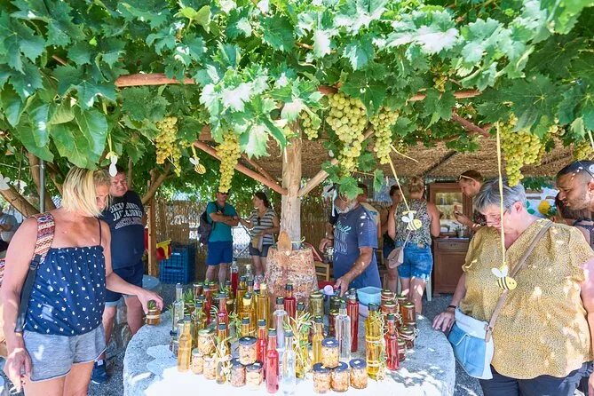 Sim — na vila de Archipoli você prova mel caseiro, souma (bebida típica), azeite, doces e frutas da estação.