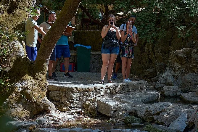 Paramos num mirante — queria lembrar o nome, mas estava tão distraído com a vista que nem perguntei. Dá pra ver o mar lá embaixo, azul sobre azul, e só o som das cigarras no ar. Depois seguimos por vilarejos onde os velhinhos sentavam nas portas dos cafés observando a gente passar (um até acenou, ou será que estava espantando um gato?). Nas Sete Fontes, o guia contou sobre o túnel — escuro, estreito e meio gelado por dentro, mesmo com o calor lá fora. Passar por ali parecia um segredo local sendo revelado.