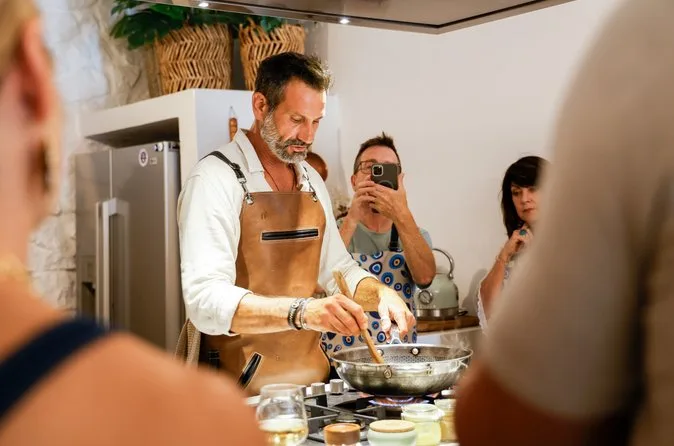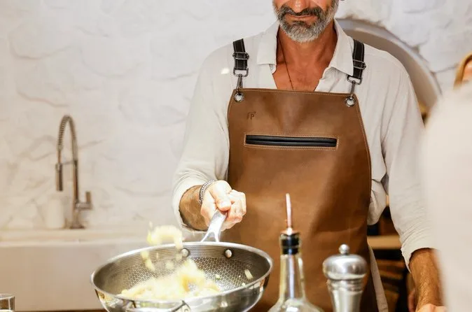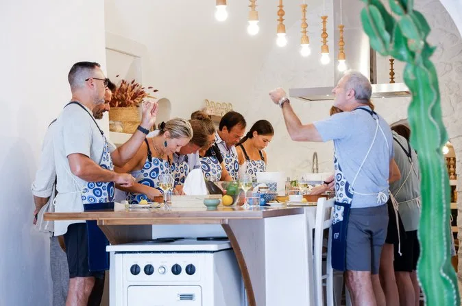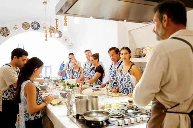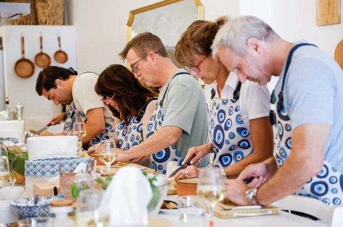 Seu dia inclui aperitivos e vinho local na chegada, todos os ingredientes e utensílios para uma aula prática de culinária grega guiada por locais dentro de uma casa de gruta em Santorini, uma refeição completa na varanda com mais vinho ou refrigerantes, sobremesa cortesia, café grego para finalizar e um livro de receitas para levar para casa.