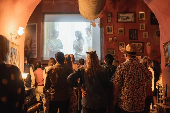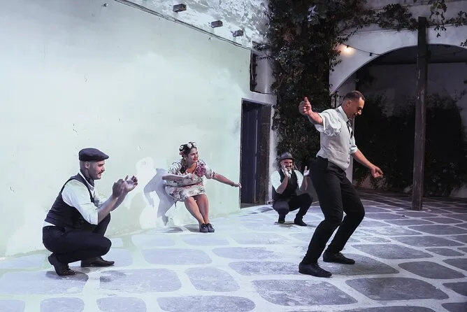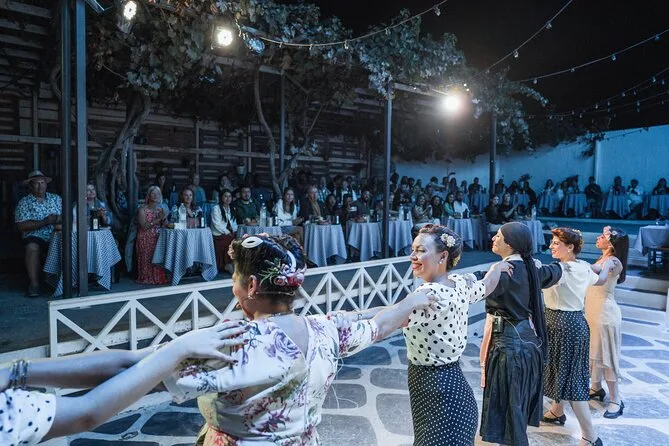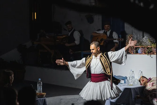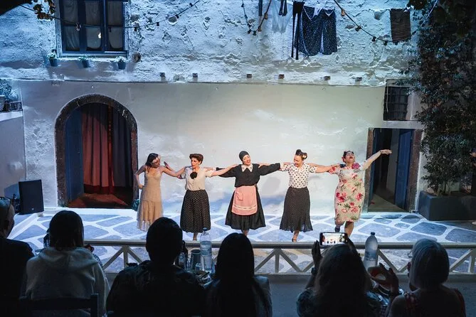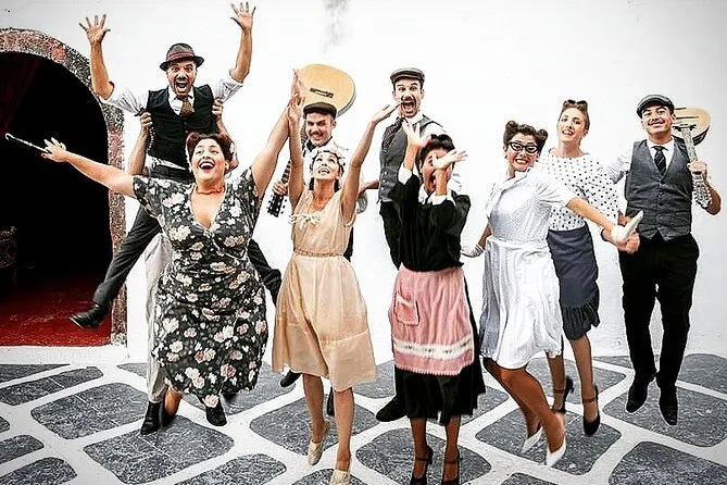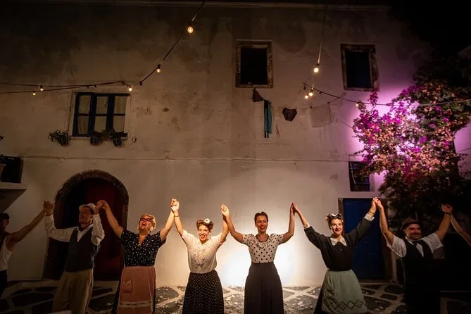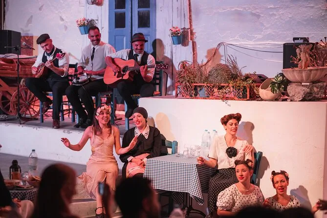 Sua noite inclui assento reservado no mezanino superior do White Door Theater, petiscos gregos estilo meze (não é jantar completo), vinho branco local de Santorini e água mineral servidos na sua mesa privativa—todos os impostos e taxas já inclusos antes da sua chegada.