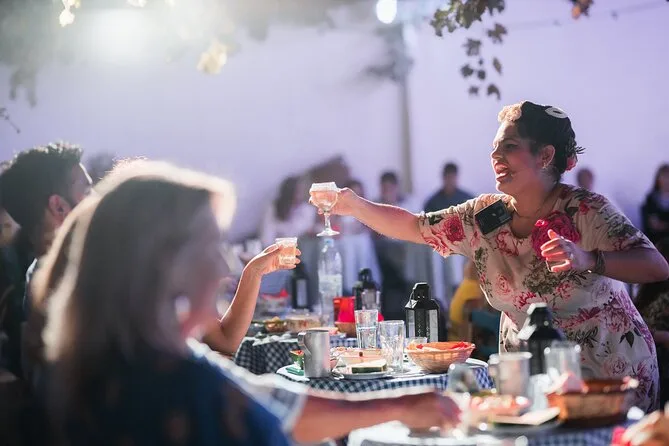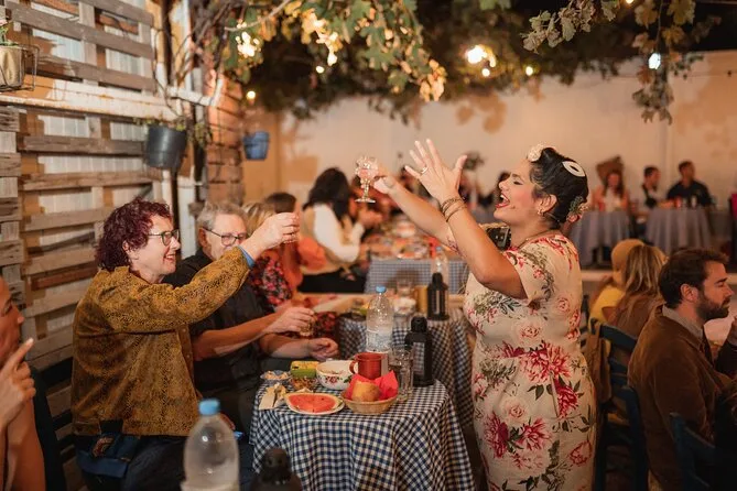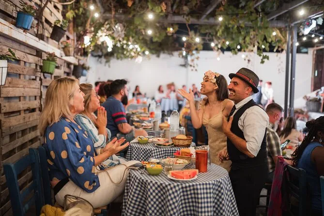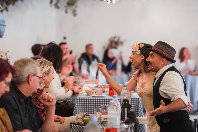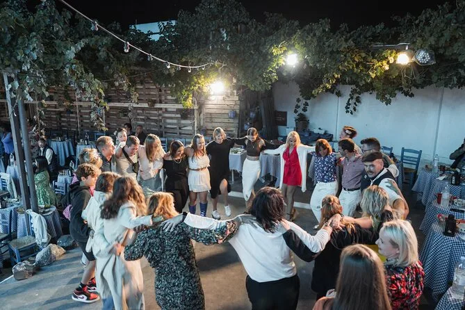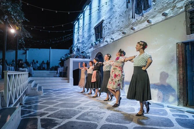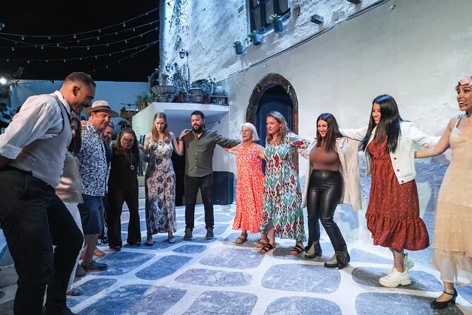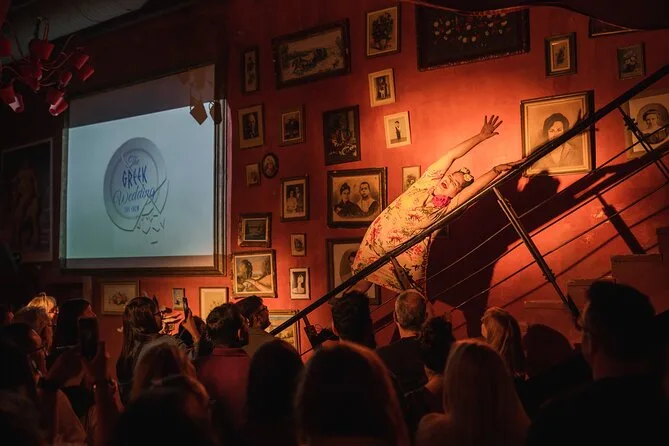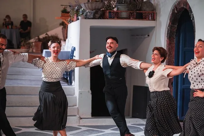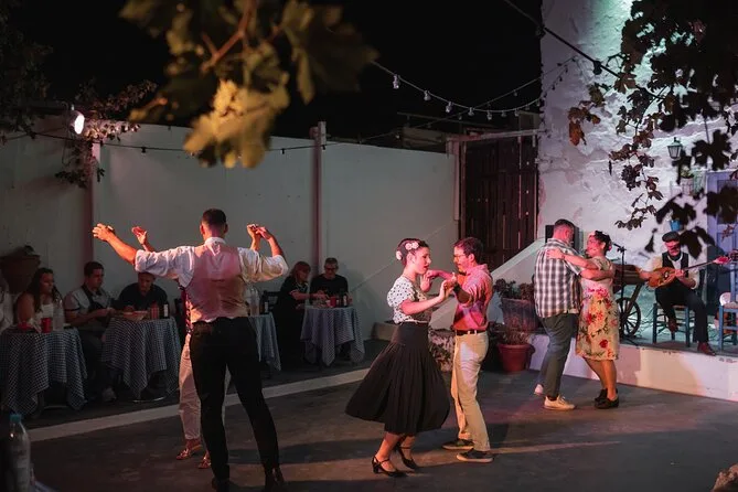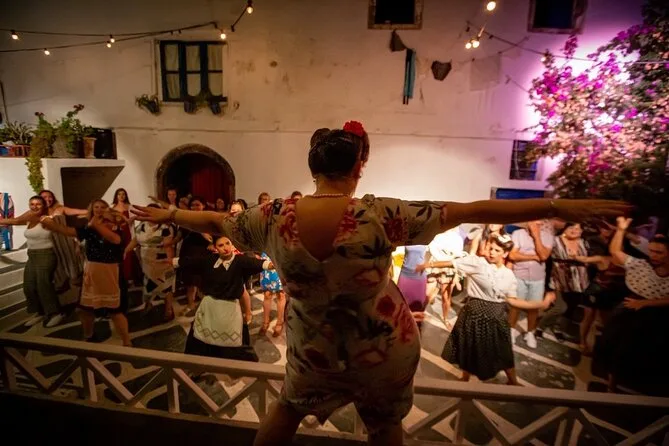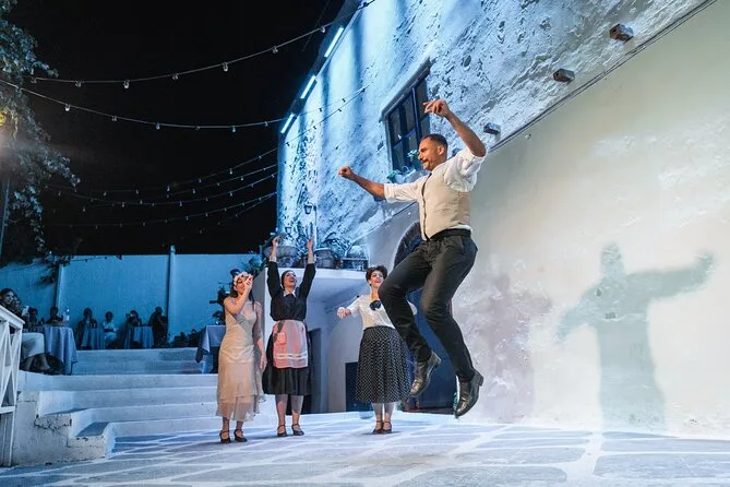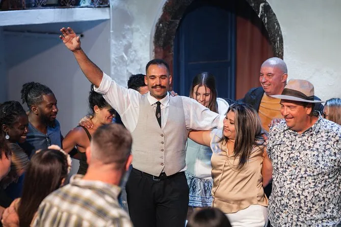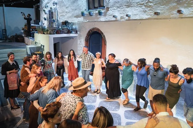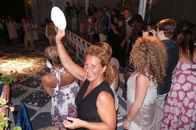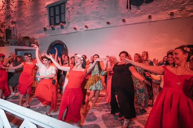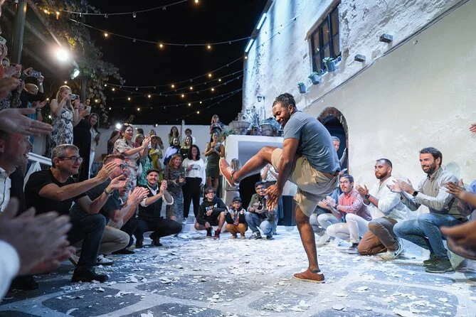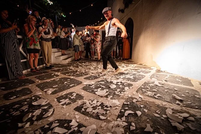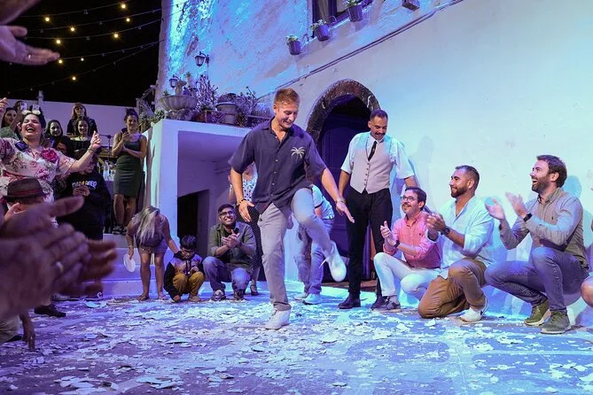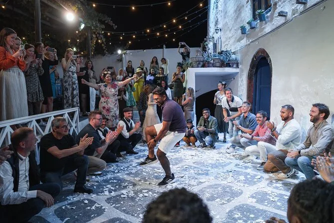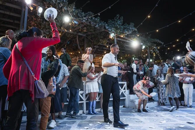 Você vai entrar de cabeça numa festa de casamento grega em Santorini—dançando ao som de música ao vivo sob o céu aberto, aprendendo passos de Zorba com os locais, quebrando pratos com novos amigos e saboreando petiscos meze na sua mesa. Risadas, vinho local e momentos que ficam na memória muito depois da última música.