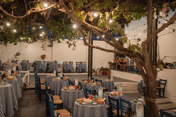 Seu ingresso inclui petiscos gregos no estilo meze—não é um jantar completo—além de vinho branco local e água mineral.