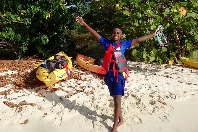 Seu dia inclui água engarrafada, uma barrinha de chocolate para o lanche após o snorkel em Scott’s Beach, todo o equipamento de caiaque e snorkel fornecido pelo guia local — além de várias dicas durante o trajeto antes de voltarmos juntos para Cruz Bay.