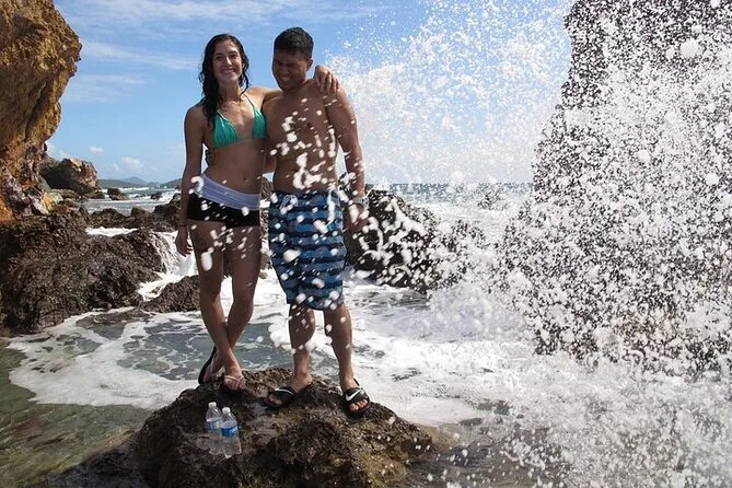 Depois de uns 30 minutos (perdi a noção do tempo), desembarcamos em Cas Cay. O sol apareceu forte — minha camiseta grudou nas costas — e Li apontou umas pedras pretas estranhas. Ela chamou de falésias vulcânicas, algo que eu não esperava numa ilha assim. Subimos até um ponto onde o mar batia nas pedras e jorrava água por um buraco natural. Todo mundo ficou em silêncio por um instante só olhando — tinha algo hipnotizante na cena. O almoço era simples, mas depois de tanto remar, parecia uma delícia: sanduíches, frutas e água gelada. Lembro de estar sentado nas pedras, sem sapatos, com os pés na areia.