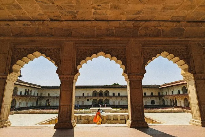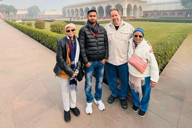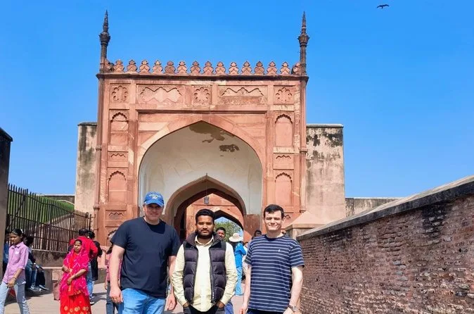 Depois, fomos explorar o Forte de Agra. As paredes são feitas de uma pedra vermelha tão intensa que parece aquecer mesmo na sombra. Nosso guia contou histórias de imperadores e traições—me fez rir quando chamou um deles de “o rei do drama original.” De dentro do forte, dá para ver o Taj de novo, enquadrado perfeitamente por arcos impressionantes. O almoço foi num hotel chique, buffet à vontade (eu provei tudo duas vezes, sem vergonha). O dal tinha um sabor defumado que até hoje me lembro.