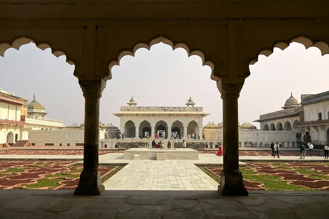 A primeira vista do Taj Mahal naquela luz suave da manhã — é difícil explicar sem parecer clichê. Tinha uma névoa leve pairando sobre os jardins e, quando o sol começou a bater no mármore, ele parecia brilhar em tons de rosa. Rajesh nos contou sobre Shah Jahan e Mumtaz Mahal enquanto caminhávamos descalços pela pedra fria (eles dão capas para os sapatos, mas eu quis sentir o chão). Tentei tirar fotos, mas me distraía com cada detalhe — os entalhes florais, os pássaros voando por cima. Havia mais gente do que eu esperava, mesmo no amanhecer, mas ainda assim o lugar parecia tranquilo. Em um momento, Rajesh apontou um lugar onde dava para ver o rio e a cúpula enquadrados perfeitamente — até hoje penso naquela vista.