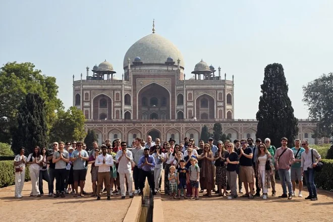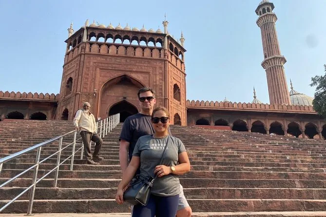 Você vai mergulhar nos contrastes intensos de Delhi — passeios de rickshaw pelas ruas labirínticas da Velha Delhi, a calma descalça na Jama Masjid, refeições compartilhadas no Gurudwara Bangla Sahib e momentos silenciosos sob arcos mogóis. Com guia local e transfer fácil, você vai se perder e se encontrar no ritmo dessa cidade.