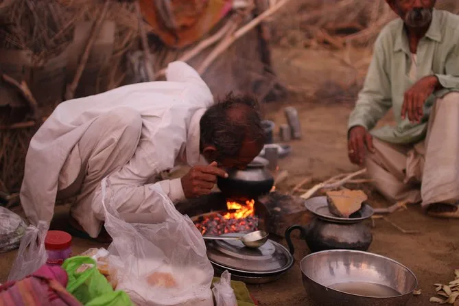 No final da tarde, chegamos a uma área de dunas intocadas — sem multidões ou vendedores por perto. Só nós, os camelos e ondas douradas sem fim. O sol começou a se pôr e tudo ficou em tons de dourado e laranja; senti a temperatura cair conforme a noite chegava. Nossos guias montaram o acampamento ali mesmo na areia. O jantar foi preparado na fogueira — um simples dal com chapati — mas, de alguma forma, tinha um sabor melhor que qualquer restaurante da cidade. Sentamos ao redor trocando histórias enquanto tomávamos chai doce sob um céu cheio de estrelas (sério, nunca tinha visto tantas). De manhã, acordei no silêncio, só o som distante dos sinos dos camelos e o cheiro do café forte sendo preparado nas brasas.