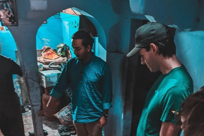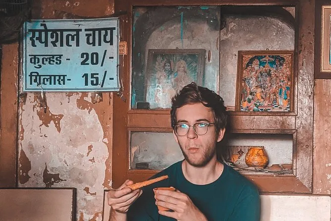 A caminhada terminou no templo Govind Dev Ji, exatamente quando as orações matinais acabavam — o cheiro de incenso pairava no ar e famílias se reuniam do lado de fora compartilhando doces. Finalizamos em uma loja de chai próxima, tomando chá quente e kachoris apimentados enquanto trocávamos perguntas com nosso guia. Ele até compartilhou algumas fotos que tirou durante o passeio (não fazia ideia de quantos momentos espontâneos ele capturou). Três horas passaram voando sem que percebêssemos.