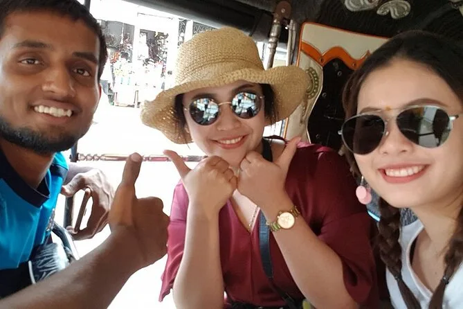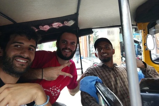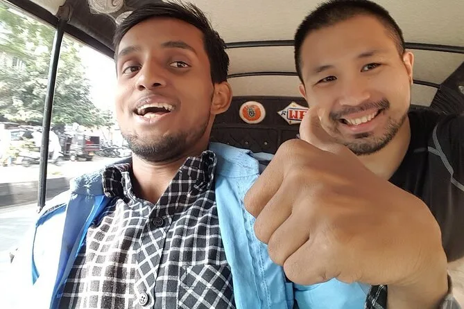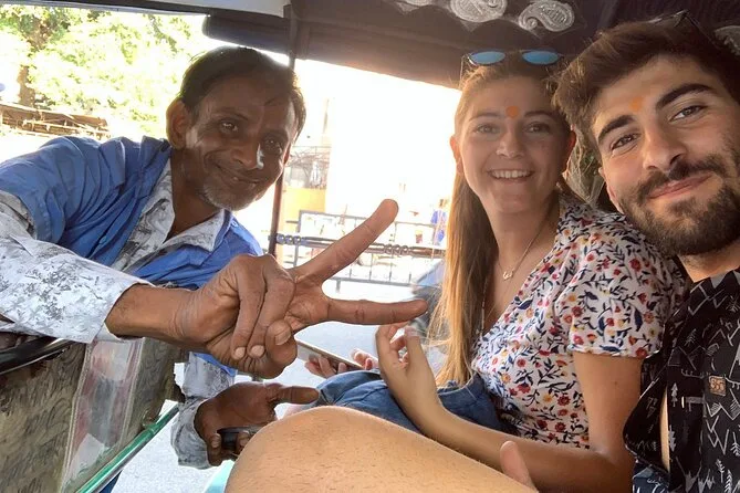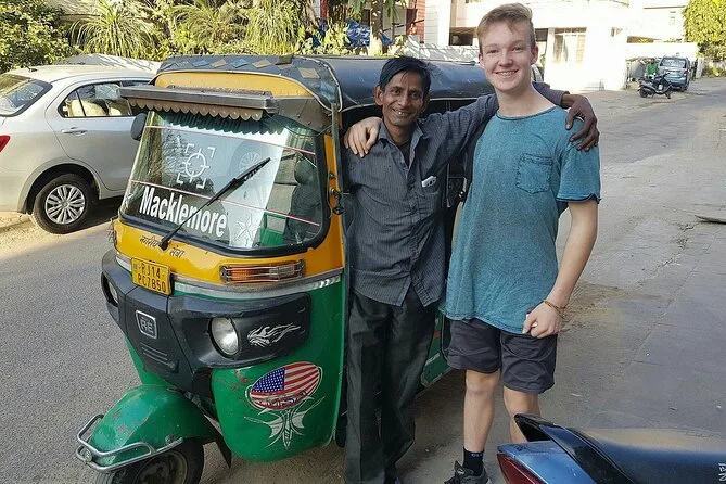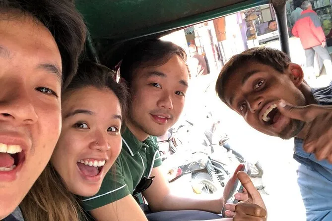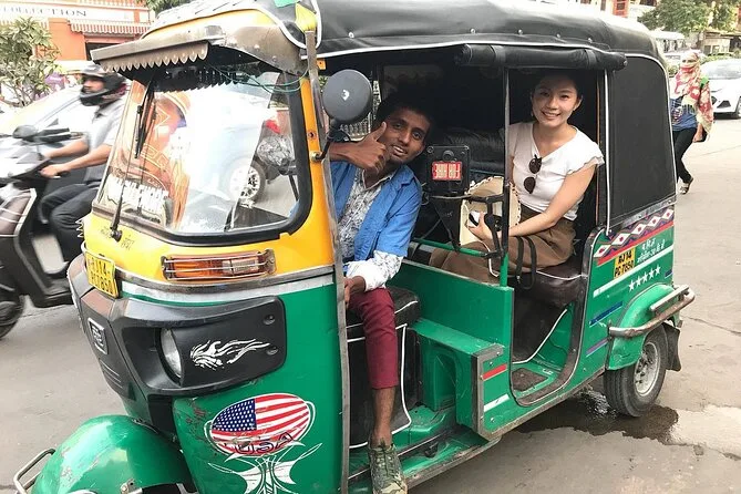 Um tuk tuk privado de três rodas (auto riquixá) é usado para todo o transporte durante o passeio.