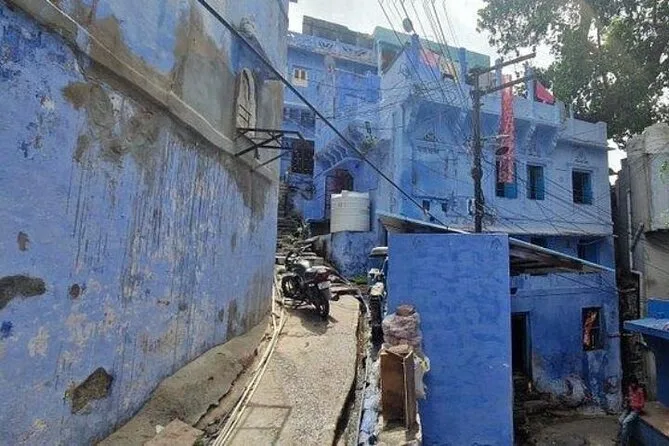 Seu dia inclui transporte privado com busca e retorno no hotel (ou escritório próximo se a rua for estreita), água mineral para o passeio, todas as taxas e encargos pagos antecipadamente, além do acompanhamento de um guia local que conhece todos os atalhos pelas ruas da Cidade Azul de Jodhpur.