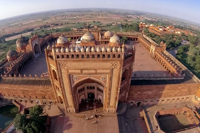 Depois de uma pausa rápida (e uma garrafa de água — acredite, você vai precisar), seguimos para Fatehpur Sikri. A estrada fica um pouco esburacada em alguns trechos, mas nada demais. Quando nos aproximamos, os portões de arenito vermelho apareceram, e de repente você está onde imperadores já caminharam. Ramesh apontou detalhes que eu teria perdido: arcos persas misturados com entalhes hindus, desbotados, mas ainda nítidos se você olhar de perto. Ele nos contou que Akbar construiu essa cidade para Sheikh Salim Chishti, cujo túmulo de mármore branco repousa silencioso dentro do complexo. Dá para imaginar como era esse lugar quando fervilhava de vida — embora agora, além de alguns estudantes em excursão e alguns pombos, esteja quase sempre tranquilo.