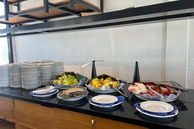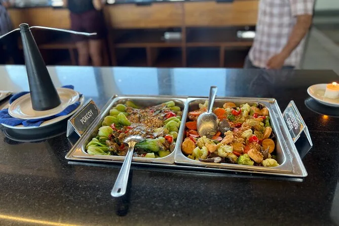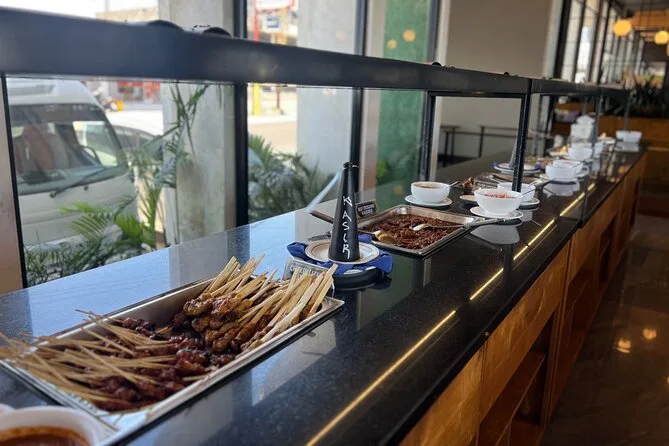 O buffet oferece opções vegetarianas e não vegetarianas típicas da culinária indonésia.