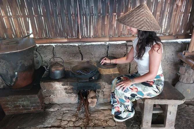Depois seguimos para a região do café — Bali Kuno Coffee Plantation. O dono mostrou como eles torram os grãos no fogo de lenha; dava para sentir o cheiro antes mesmo de ver a fumaça. Provamos de tudo: kopi bali, chá de gengibre, até um café com chocolate meio estranho (não foi meu favorito, mas valeu a experiência). O almoço foi no Grand Puncak Sari, com vista para o Monte Batur — aquele tipo de cenário que faz você esquecer do celular por um tempo. O buffet tinha satay de frango apimentado e uma sobremesa doce feita com açúcar de palma — até hoje penso nela.