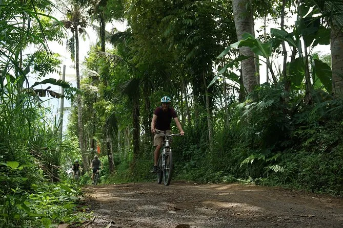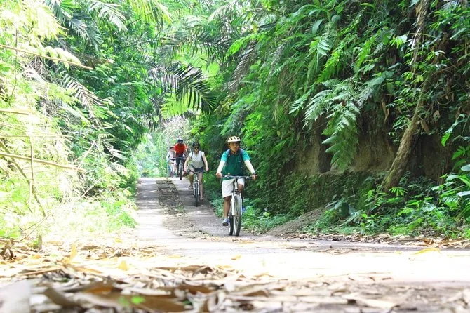 O dia inclui transporte com ar-condicionado para busca no hotel em Ubud, todo o equipamento para bicicleta e capa de chuva se necessário, guia em inglês durante o passeio, pausa para café da manhã com opções de snacks ou smoothie para quem não consome glúten, água durante o trajeto, visitas a casas locais e templos como Gunung Raung e Hyang Api, além de almoço tradicional indonésio com vista para os arrozais, finalizando com retorno ao hotel.