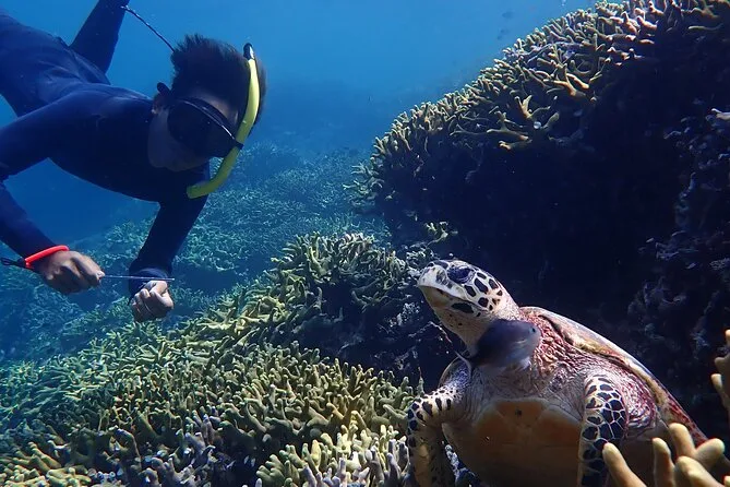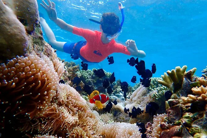 Paramos no primeiro ponto de snorkel — nem sei o nome direito — e a água estava tão cristalina que dava pra ver os peixes-papagaio antes mesmo de mergulhar. O coral parecia tão perto que dava vontade de tocar (mas claro que não fiz). Aqueles formatos e cores estranhos se mexendo na correnteza. Me distraí com uma tartaruga passando devagar — todo mundo ficou olhando — e Wayan só sorria, parecia que tinha planejado aquilo. O cheiro da máscara ficou um pouco, mas você esquece assim que começa a flutuar naquele azul todo.